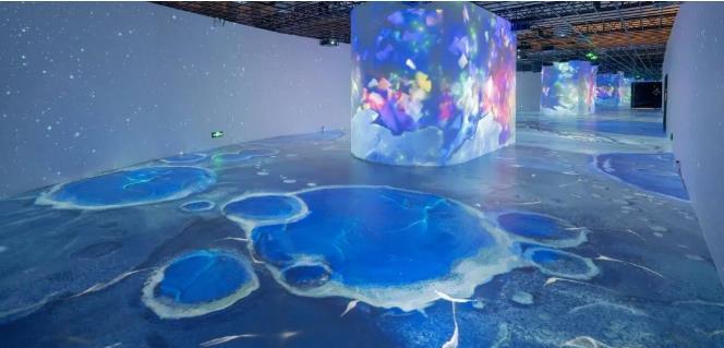 《盛开的数字雪花》展区,观展人员可依照提示生成属于自己彩色雪花。观展过程中,数字生成的彩色雪花会跟随小朋友在展厅飘舞,展区摇身一变为孩子们的梦幻游乐场。