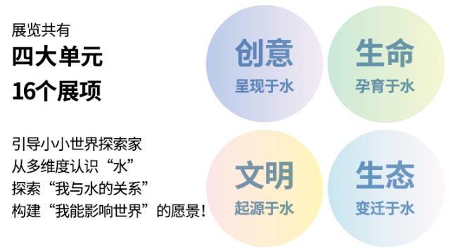 展览共有四大单元16个展项,全程120分钟,引导孩子从物理性质、自然史、文明史、生态系统等维度全方位地认识水、感受水。