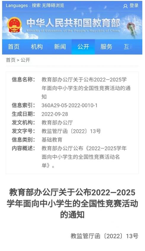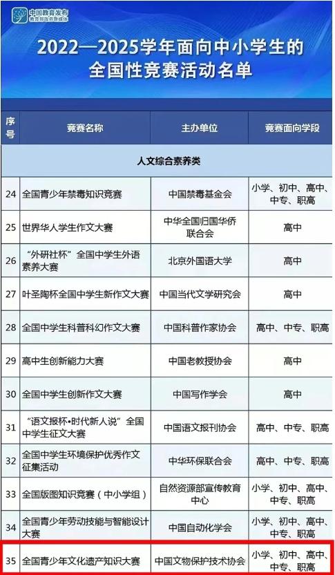 2022年教育部公示了44项面向中小学生的全国性竞赛活动名单,其中“全国青少年文化遗产知识大赛”位列人文综合素养类第35项。