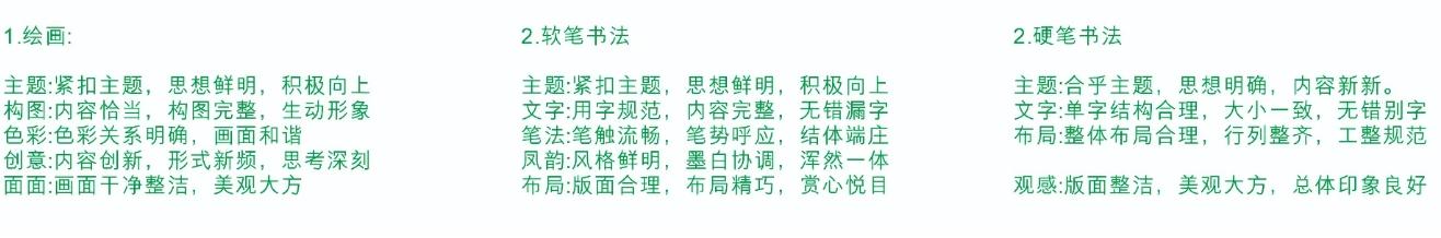 参赛科目:软笔书法、硬笔书法、篆刻、中国画、水彩、油画、油画、素描、漫画、儿童画等