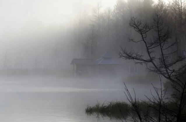 云雾撕开一道裂口,山林黄绿相间隐没在其中。晨雾浓郁,翻滚在湖面,晨曦划开氤氲缝隙,远处有船突然划出。天渐亮,色调愈温柔,那是一种很纯粹的美。